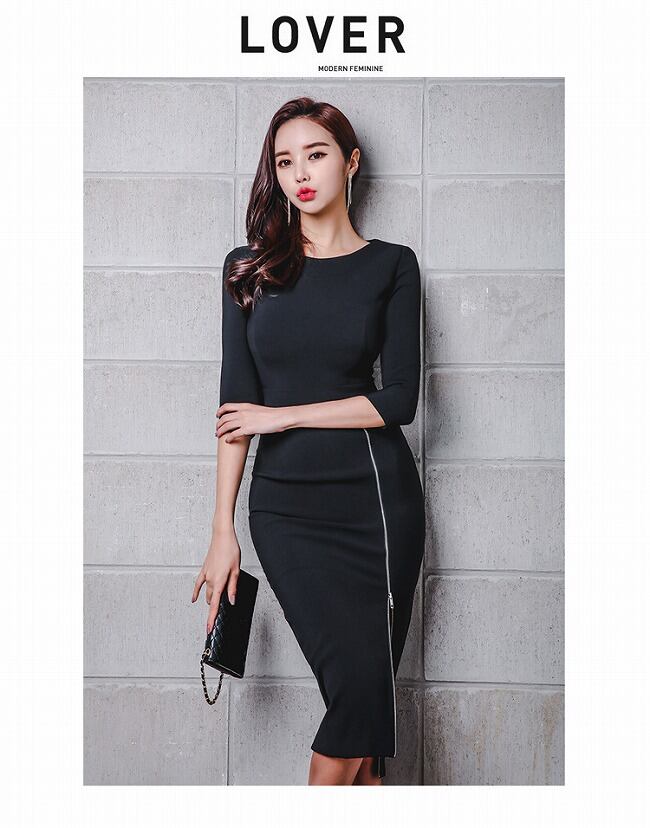 きっちりチャックを閉めてスリットなしのきちんとスーツワンピースで決めて、