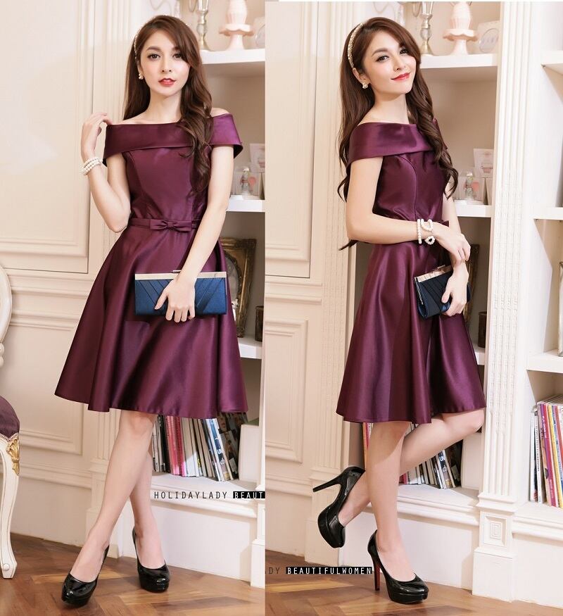 膝丈、鎖骨見せ、オフショルダー 背中V開きドレス