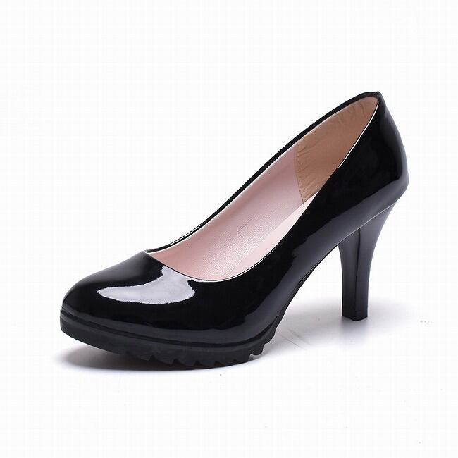 光沢のあるPUレザー素材のハイヒールパンプスです。