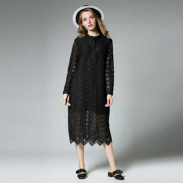 ミモレ丈ワンピース 長袖 袖あり ぽっちゃり ゆったり 大きいサイズ 大人 上品 総レース ブラック 黒 白 紺 ネイビー ホワイト 2L 3L 4L 5L 普段使い お呼ばれ 演奏会 着やせ効果 フェミニン 透け感 体型カバー