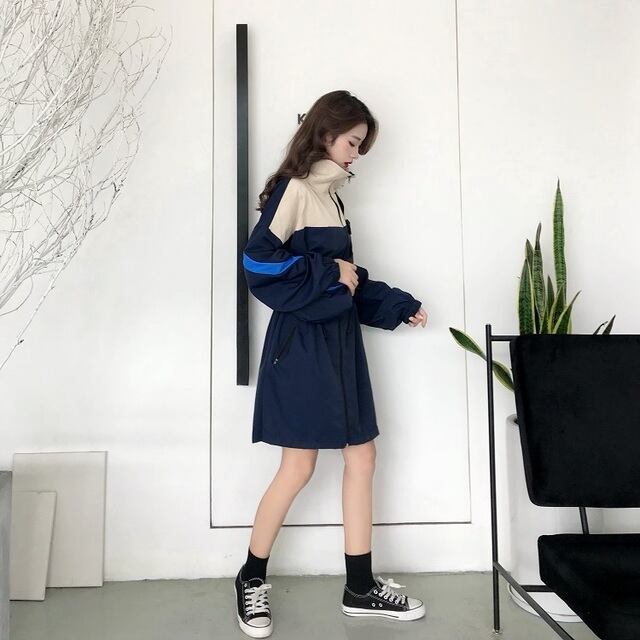 マウンテンパーカー レディース ミディアム ライトアウター 体型カバー 袖あり 長袖 二の腕カバー ゆったり おすすめ スポーティー 普段使い 甘辛ミックス ウインドブレーカー膝上 スポーツミックス ツートーン 体型カバー おすすめ スポーティー