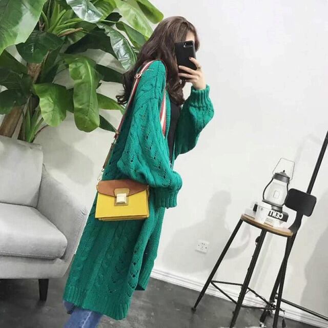 ゆったりとしたざっくり編みのニットカーディガンです。