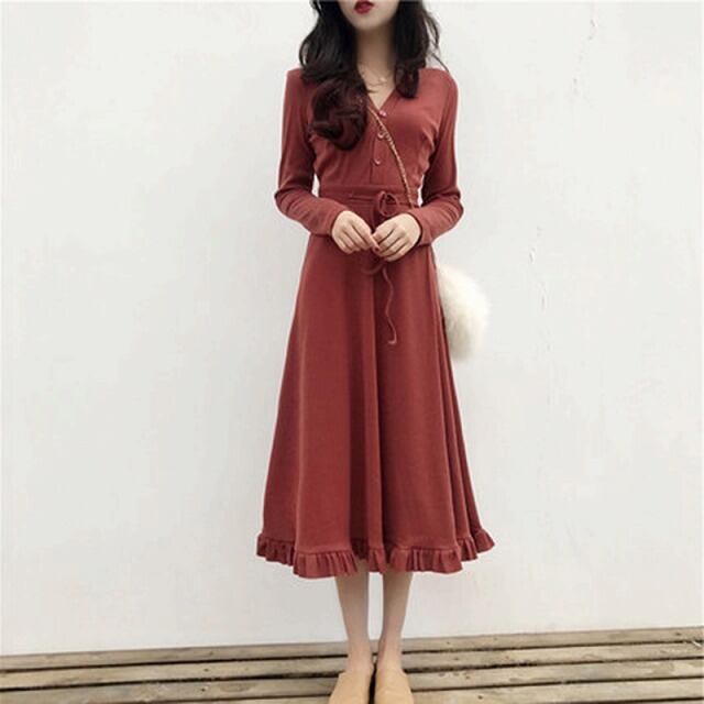 ワンピース レディース ニットワンピース 秋冬 ロングワンピース 長袖 秋 ニット ワンピース 大きいサイズ ワンピース ひざ丈 ウエスト 編み上げ 大人可愛い お洒落 美脚 足長 個性的 袖あり 長袖 普段使い カジュアル リボン フェミニン 甘め ボタン Vネック