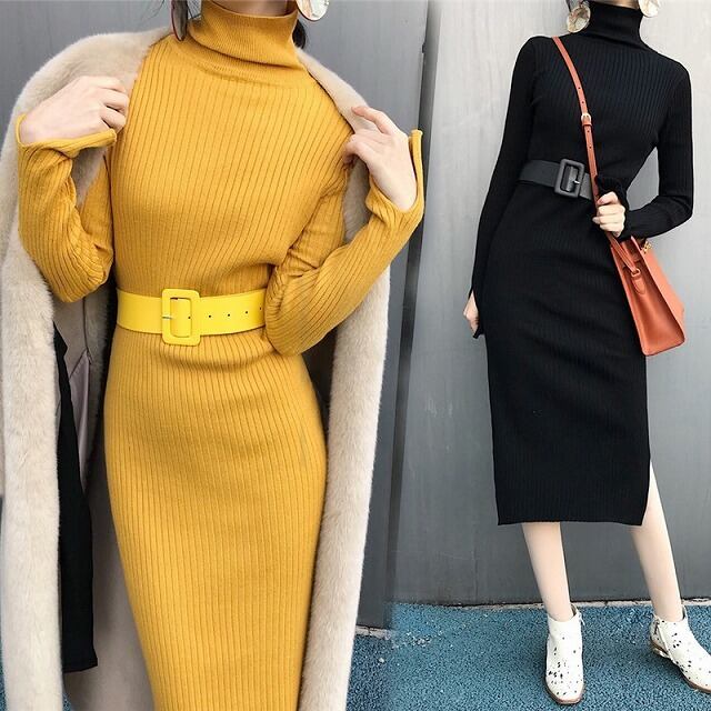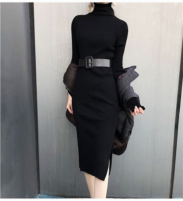 ワンピース レディース ニットワンピース 秋冬 ロングワンピース 長袖 秋 ニット ワンピース 大きいサイズ ワンピース ひざ丈 ウエストライン 大人可愛い 美脚効果 足長 無地 カジュアル 普段使い 長袖 ベルト付き 辛め モノトーン タートルネック