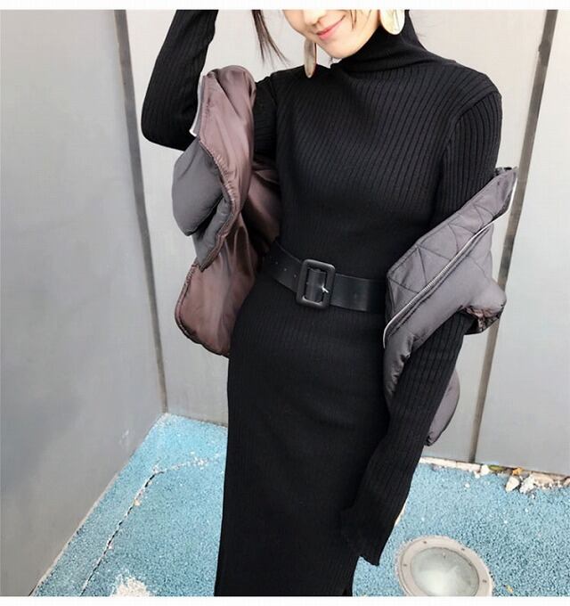 少し短めなタートルとシンプルなデザインが合わせやすいニットワンピースです。