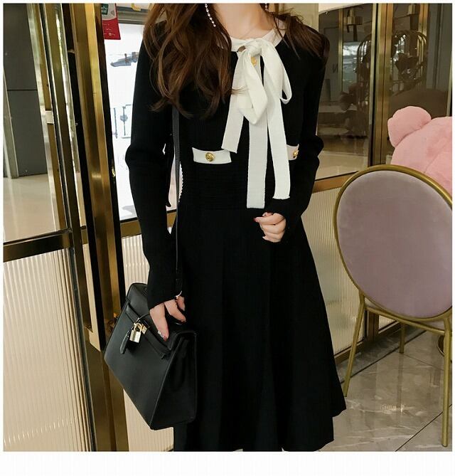 ワンピース レディース ニットワンピース 秋冬 ロングワンピース 長袖 秋 ニット ワンピース 大きいサイズ ワンピース ひざ丈 大人可愛い かわいい お洒落 綺麗 美脚効果 足長 リボン フェミニン 甘め 個性的 女の子 フレア 大き目 リボンタイ プリーツ