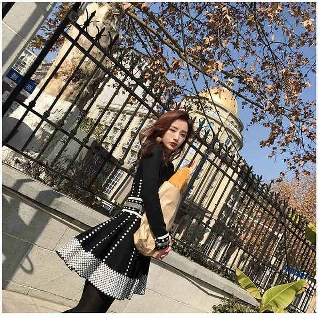 モノトーンでスッキリとおしゃれなデザインとウエストマーク効果のある柄がスタイル良く見えるニットワンピースです。