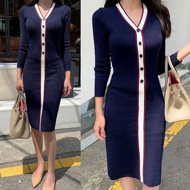 タイトシルエットとVネックがセクシーな雰囲気を醸し出すワンピースです。