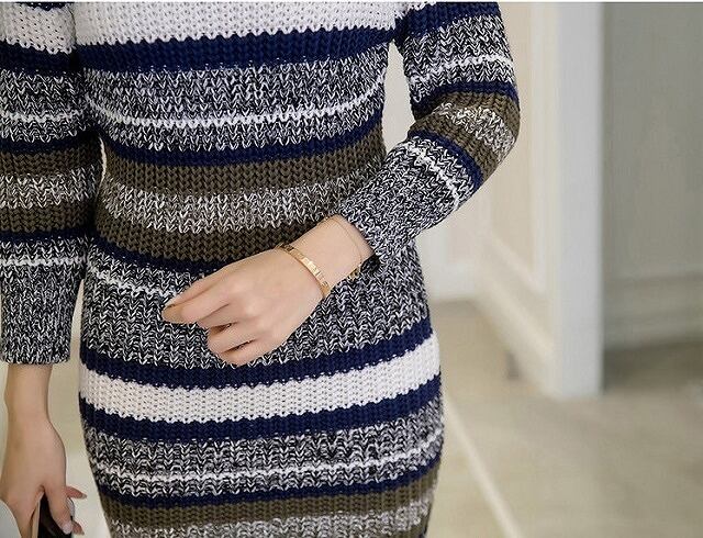ワンピース レディース ニットワンピース 秋冬 ロングワンピース 長袖 秋 ニット ワンピース 大きいサイズ 幅広ボーダー 大人可愛い 可愛い お洒落 カジュアル 普段使い タイト ボーダー
