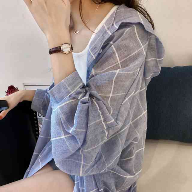 UVカット カーディガン レディース 薄手 UVカーデ ロングカーディガン 大きいサイズ レディース 羽織り UV対策 紫外線 対策 冷房対策 日焼け トップス 春 夏 透け感 シースルー 体型カバー 二の腕カバー ゆったり ゆるい シャツワンピース フード付き チェック柄 バイカラー