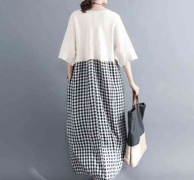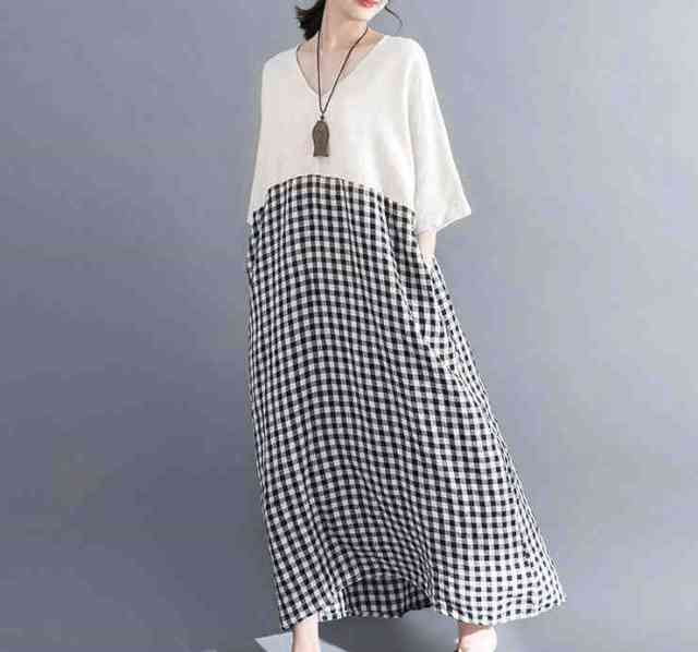 ワンピース レディース 膝丈 ワンピース カジュアル 半袖 大きいサイズ 春 夏 ワンピ Vネック マキシ丈 ギンガムチェック チェック柄 切替デザイン ゆったり ゆるい ビックシルエット 体型カバー 二の腕カバー 痩せて見える 10代 20代 30代 40代 50代 袖あり 五分袖 Aライン