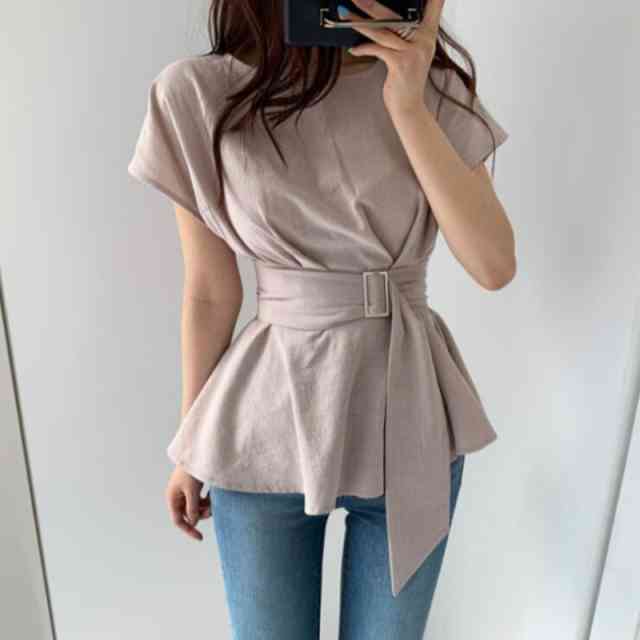 ブラウス レディース 半袖 シャツ 春 夏 春夏 大きいサイズ トップス 綿100% きれいめ 袖コンシャス 体型カバー 袖あり 二の腕カバー ゆったり ゆるい フレア袖 ベルト付き ぺプラム クルーネック 無地 10代 20代 30代 単色 通勤 お呼ばれ パーティー ビジネス OL ミセス