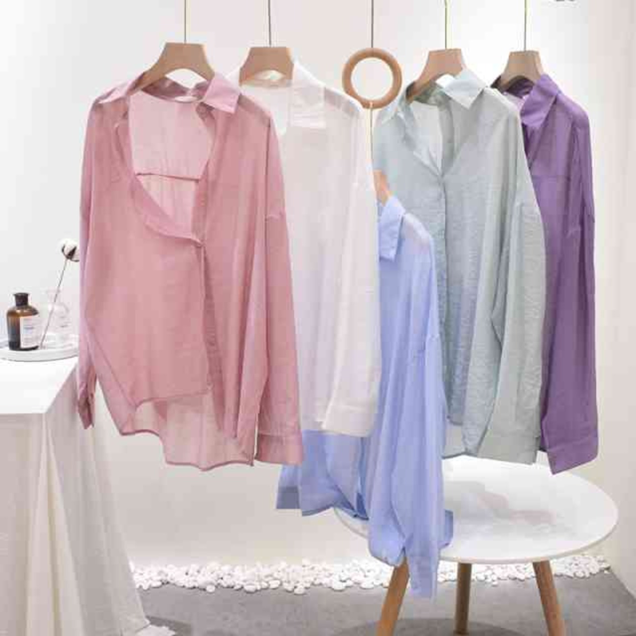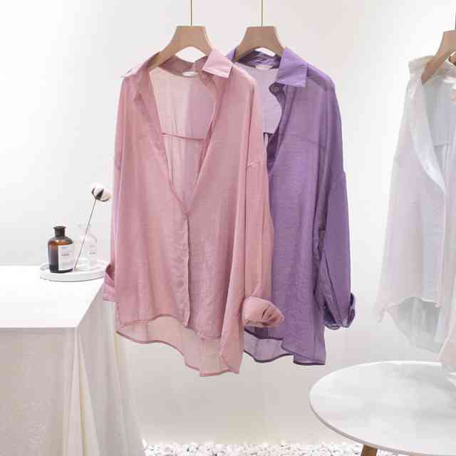 ブラウス レディース 長袖 シャツ 春 夏 春夏 大きいサイズ トップス きれいめ 体型カバー 袖あり 二の腕カバー ゆったり ゆるい シースルー 透け感 無地 シンプル 涼し気 UV対策 紫外線対策 冷房対策 重ね着OK 襟付き ボタン 単色 オーバーサイズ 通勤 OL ミセス ママ