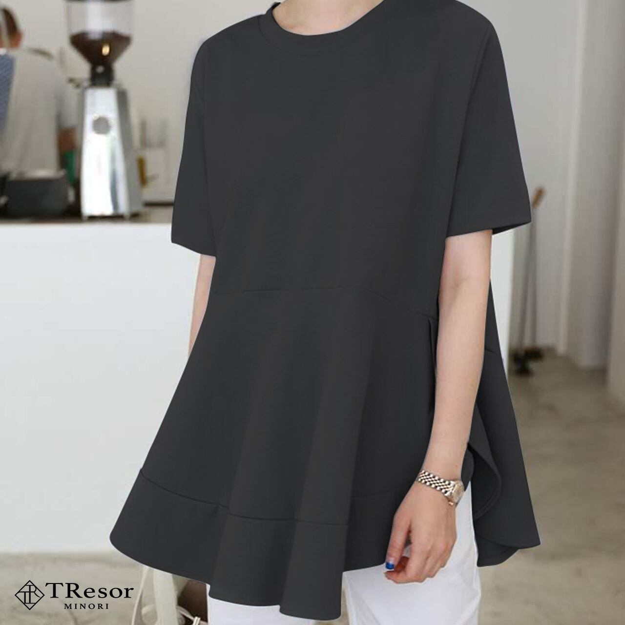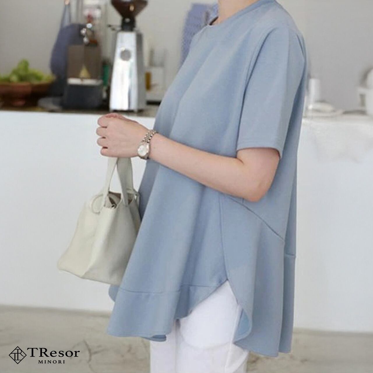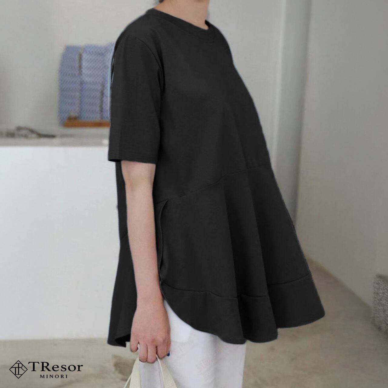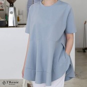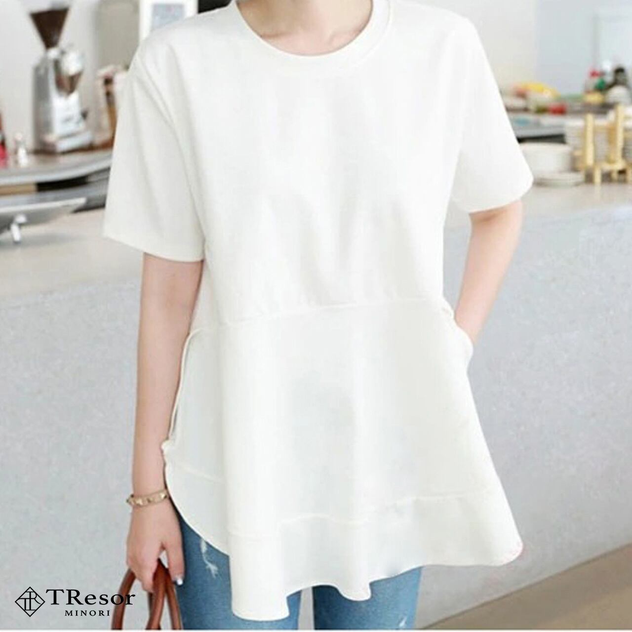 カットソー レディース Tシャツ カジュアル 半袖 トップス シンプル 大きいサイズ 春 夏 秋 薄手 フリル チューリップ サイドライン ゆったり ゆるい 袖あり 体型カバー ふんわり 無地 切り替え クルーネック 痩せて見える ペプラム 20代 30代 40代 50代 ママ ミセス 通勤