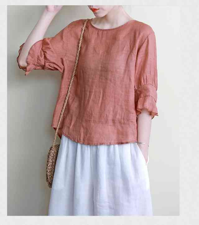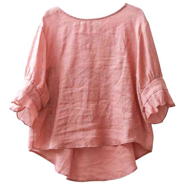 ブラウス レディース トップス シャツ 五分丈 春 夏 秋 春夏 大きいサイズ トップス シンプル 無地 ナチュラル チュニック フレア フリル フィッシュテール フレア袖 ラウンドネック リネン 透け シースルー ガーリー バックシャン 20代 30代 40代 50代 ママ お出かけ 普段着