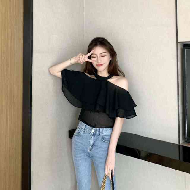 ブラウス レディース トップス シャツ 半袖 春 夏 秋 春夏 大きいサイズ トップス シンプル 無地 フレア フレア袖 肩出し オープンショルダー ホルターネック 袖あり 体型カバー 二の腕カバー 華奢見え 痩せて見える 涼し気 デート お出かけ 10代 20代 30代 個性的 キャバ
