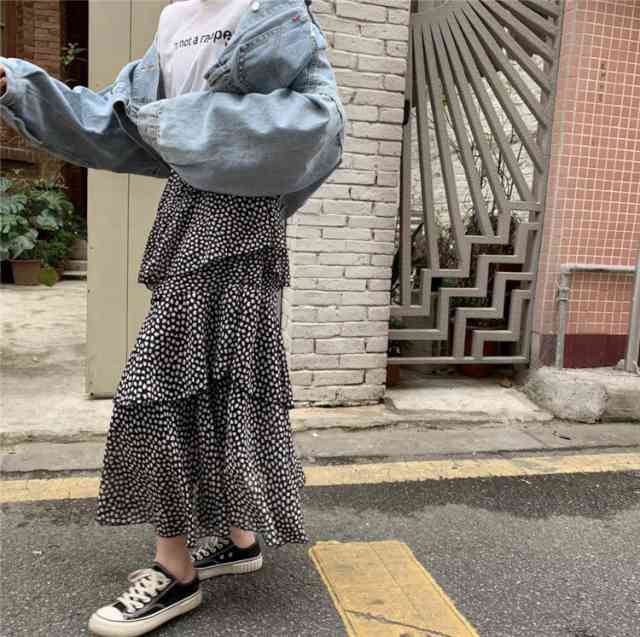 スカート レディース ロング ボトム 大きいサイズ ミモレ ミディアム丈 マキシ丈 大人 スカート フリル ドット柄 フレアスカート ユニーク 個性的 アシンメトリー フェミニン シフォン ふんわり ゆったり ゆるい 体型カバー お出かけ デート レオパード ヒョウ柄 バイカラー