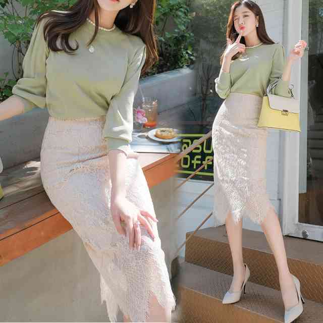 上品なフラワーレースのミディアム丈タイトスカートです。