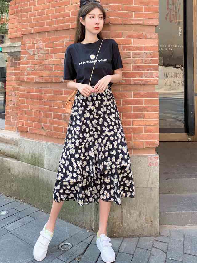 スカート レディース ロング ボトム 大きいサイズ ミモレ ミディアム丈 大人 スカート フレアスカート ティアードスカート モノトーン花柄 デイジー シフォン Aライン ふんわり ハイウエスト 総柄 裏地 ウエストゴム 脚長効果 ゆったり ゆるい デート お出かけ 婦人服 爽やか