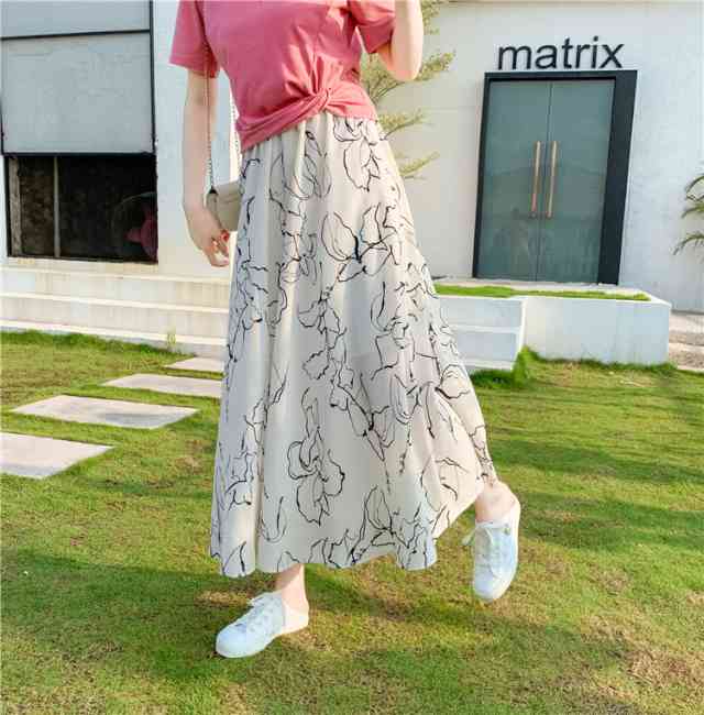 スカート レディース ロング ボトム 大きいサイズ ミモレ ミディアム丈 マキシ 大人 スカート フレアスカート ギャザー ふんわり レトロ 花柄 プリント フラワー ウエストゴム ゆったり ゆるい デート お出かけ シフォン 痩せて見える 華奢見え 婦人服 10代 20代 30代 甘い