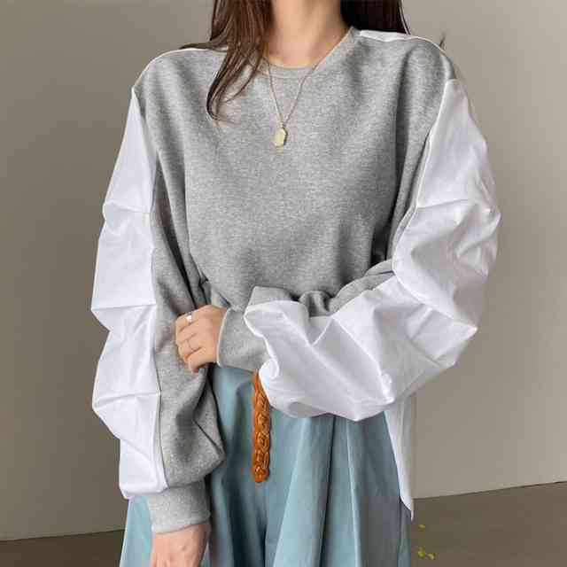 トレーナー トップス レディース スエット長袖 ロンT カットソー トップス シンプル 大きいサイズ 春 秋 冬 ラウンドネック バルーンスリーブ アシンメトリー 袖あり 他と被らない 新作 おすすめ 安い SNS映え 着痩効果 エレガント フェミニン カジュアル ゆったり ゆるい