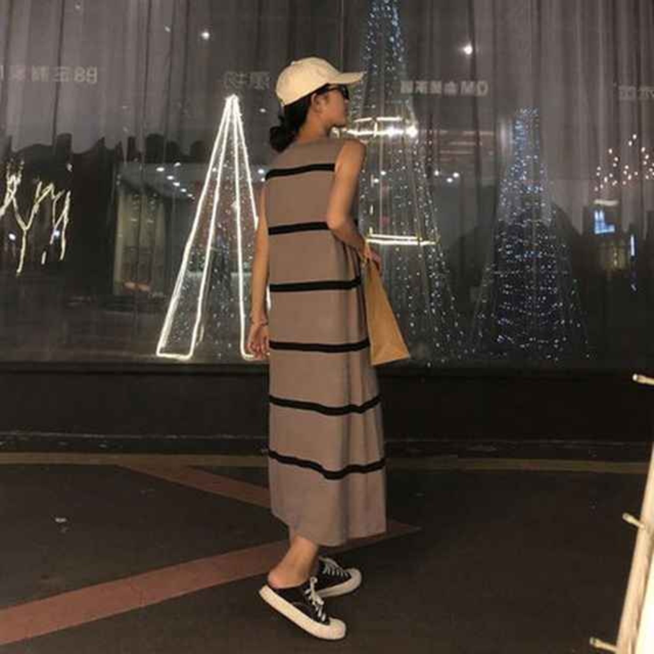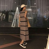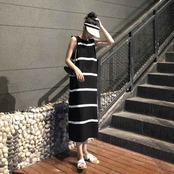 ワンピース レディース ロング丈 ニット ワンピース ニットワンピ カジュアル ノースリーブ 大きいサイズ 春 夏 秋 ワンピ Hシルエット ボーダー フェミニン ガーリー ナチュラル 体型カバー バイカラー おしゃれ キレイめ 可愛い