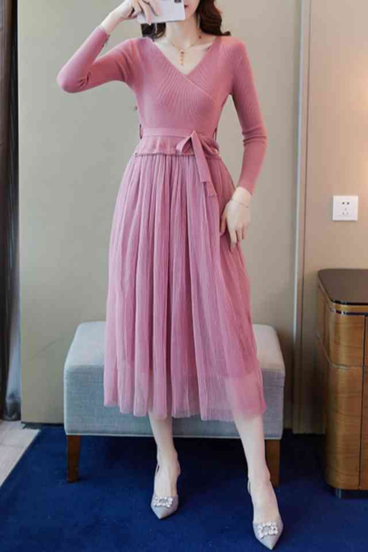ワンピース レディース ロング丈 ニット ワンピース ニットワンピ カジュアル 長袖 大きいサイズ 春 夏 秋冬 ワンピ タイトワンピース Vネック リボン チュール切り替え パーティー お呼ばれ お出かけ 結婚式 フォーマル Aライン 無地