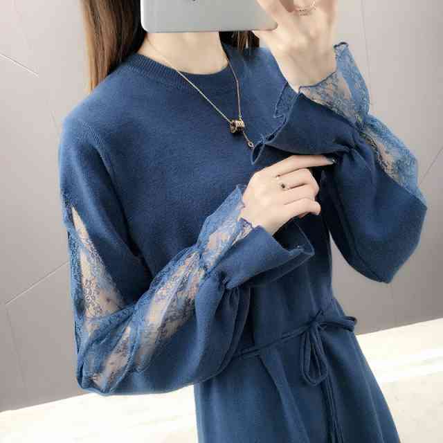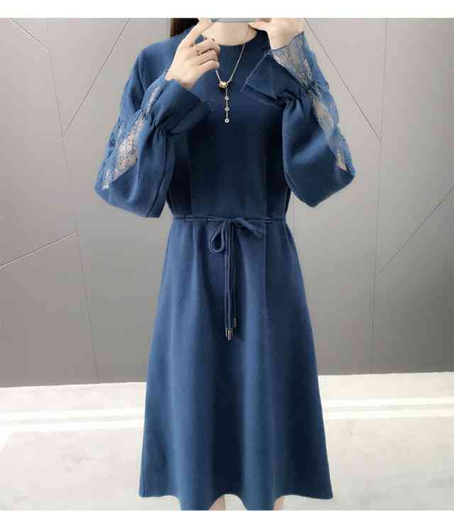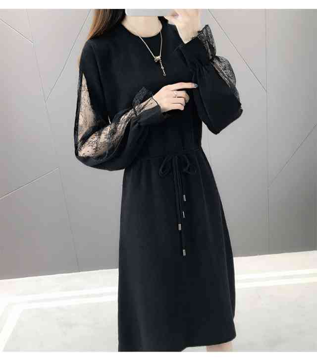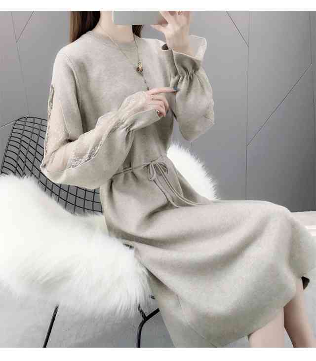 ワンピース レディース ひざ丈 ニット ワンピース ニットワンピ カジュアル 長袖 大きいサイズ 春 夏 秋冬 ワンピ クルーネック ベルスリーブ レース 袖コンシャス ウエストリボン パーティー お呼ばれ お出かけ フォーマル 異素材Mix