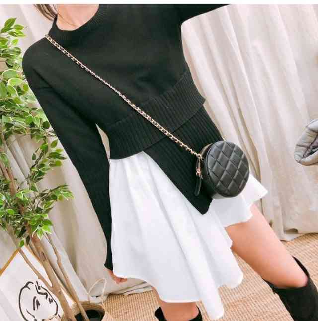 ニット レディース 長袖 ニットソー カットソー セーター ロンT トップス シンプル 大きいサイズ 春 夏 秋 冬 チュニック丈 ショート丈ワンピース 重ね着風 ドッキング フレア アシンメトリースカート ユニーク 体型カバー バイカラー