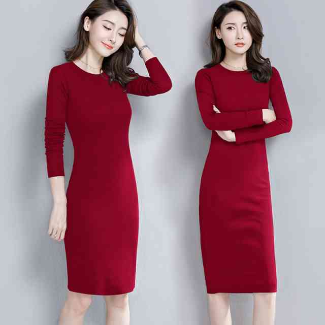 ワンピース レディース 膝下丈 ニット ワンピース ニットワンピ カジュアル 長袖 大きいサイズ 春 夏 秋冬 ワンピ クルーネック タイト スリム 華奢見え 痩せて見える 美脚効果 脚長効果 無地 シンプル お出かけ お呼ばれ デート 単色