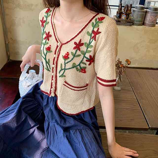 カーディガン レディース 薄手 半袖 カーデ ショートカーディガン 大きいサイズ レディース 羽織り UV対策 ボタン トップス 花刺繍 Vネック フェミニン ガーリー ナチュラル エレガント 冷房対策 SNS映え 体型カバー フォークロア 民族調