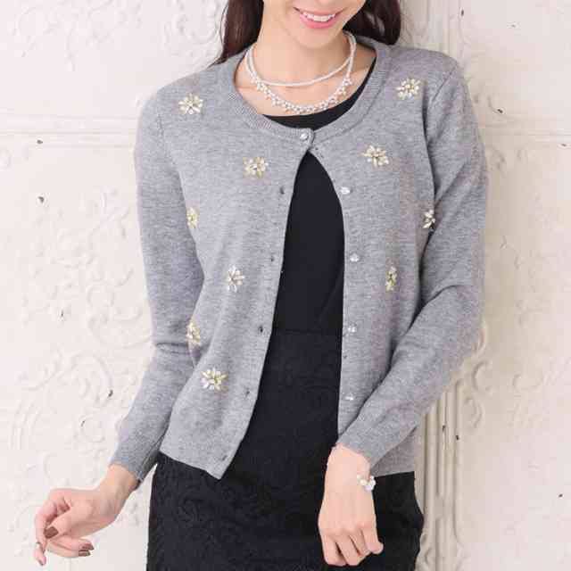 クルーネックの定番ニットカーデにビジューで刺繍をしたフェミニンスタイルです。