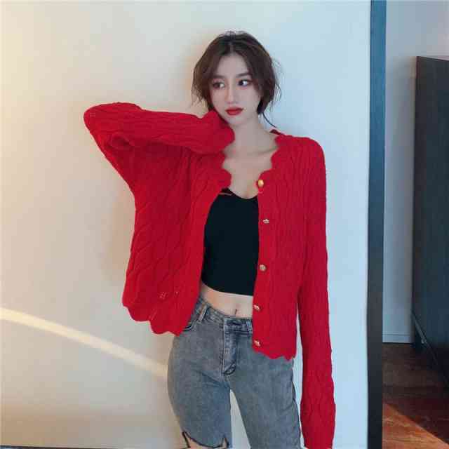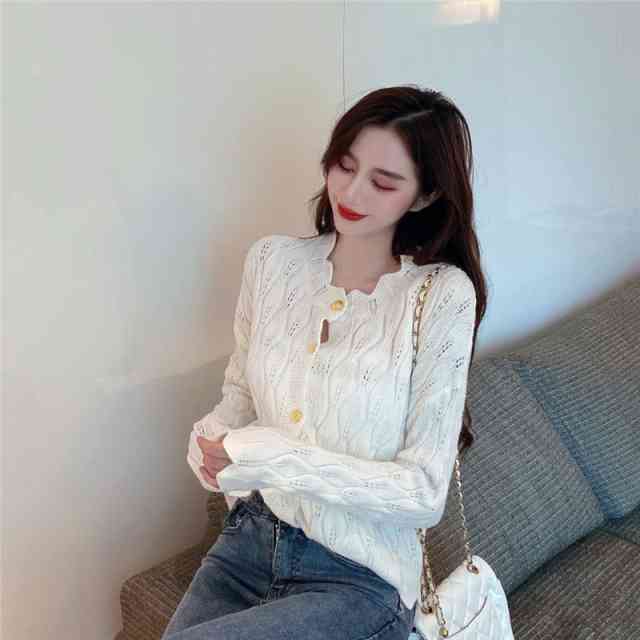 カーディガン レディース 薄手 長袖 カーデ ショートカーディガン 大きいサイズ レディース 羽織り UV対策 ゴールドボタン トップス Vネック スカラップ フリル 二の腕カバー ふんわり 婦人服 お出かけ デート カジュアル 模様編み ママ