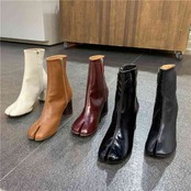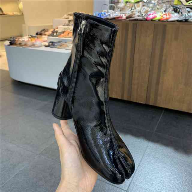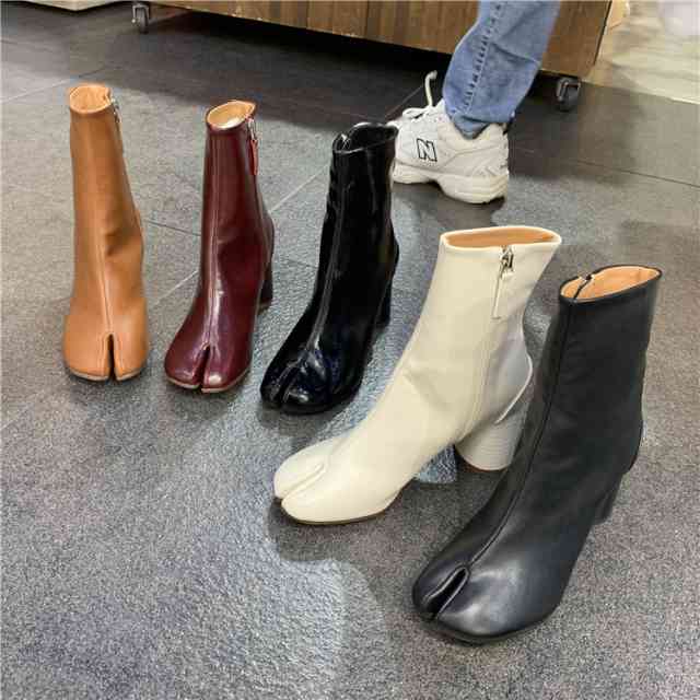 ブーツ レディース ショートブーツ 歩きやすい 7cm ヒール 秋冬 大きいサイズ 小さい 疲れない 靴 足が痛くならない 袴 卒業式 合成皮革 足袋(タビ)型 アンクルブーツ 高級感 エレガント 光沢感 フォーマル お呼ばれ チャンキーヒール