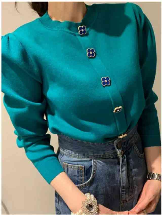 ニット カーディガン ニットコート カーデ ショート丈 厚手 ゆったり 体型カバー 長袖 コーディガン 秋冬 トップス 前開き アウター クルーネック フラワーボタン 可愛い お洒落 大人女子 ガーリー パフスリーブ シンプル フェミニン