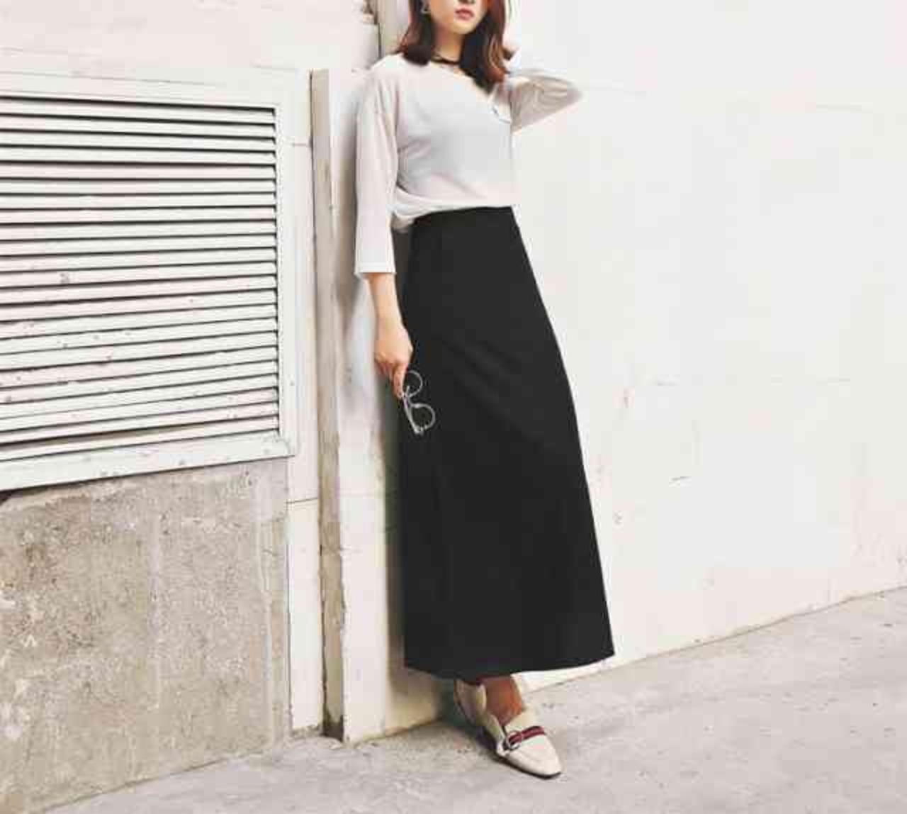 無地でシンプルなデザインが合わせやすいマキシ丈スカートです。