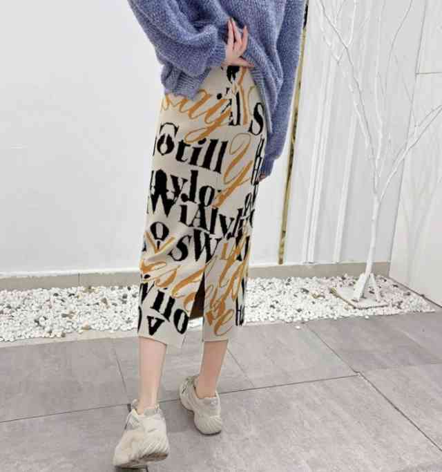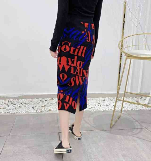 スカート レディース ロング ボトム 大きいサイズ ミモレ ミディアム丈 大人 スカート ひざ下丈 レタリング柄 ニット 個性的 可愛い お洒落 お出かけ 普段使い デート カジュアル ユニーク 英字ロゴ タイト スリット 大人女子 ペンシル