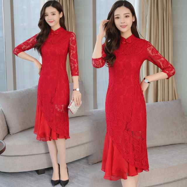 パーティードレス 結婚式 ドレス ワンピース レディース 二次会 お呼ばれ パーティー 大きいサイズ アシンメトリースカート チャイナ襟 レース 七分袖 ナチュラル お洒落 可愛い お食事会 新作 大人気 おすすめ フォーマル エレガント