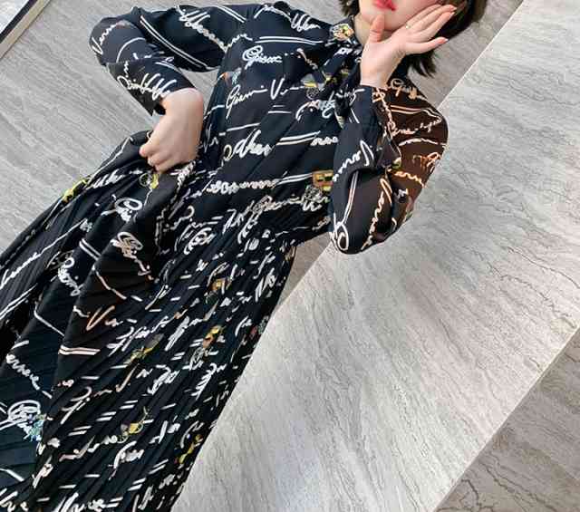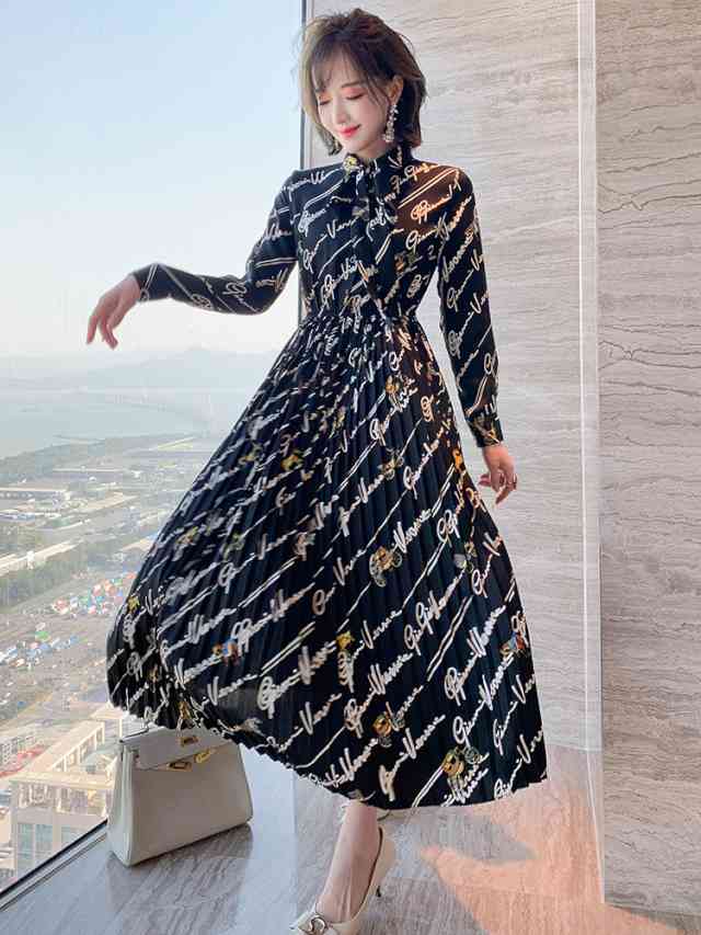 ワンピース レディース プリーツワンピース カジュアル 長袖 大きいサイズ ワンピ ロング丈 リボンタイ ボウタイ レタープリント 可愛い 大人女子 お洒落 個性的 ユニーク 普段使い お呼ばれ デート フェミニン 甘め 綺麗 通勤 ミセス