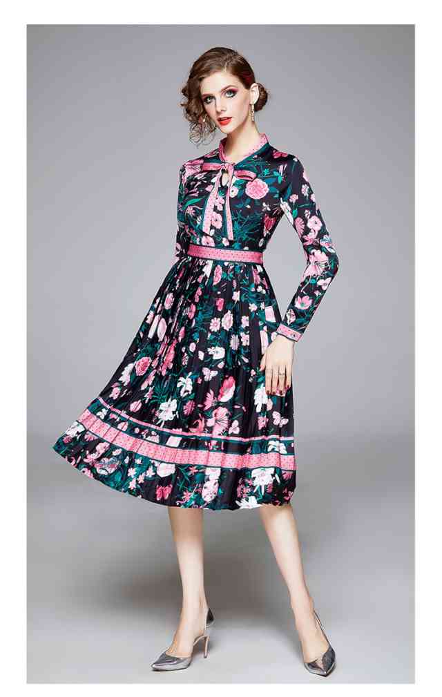 ワンピース レディース 膝丈 プリーツワンピース カジュアル 長袖 大きいサイズ ワンピ 花柄 フラワープリント リボンタイ ドット柄 ラブリー 可愛い フェミニン 甘め 個性的 派手 上品 綺麗 お洒落 大人女子 パーティー お呼ばれ OL