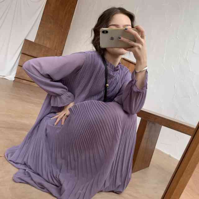 ワンピース レディース プリーツワンピース カジュアル 長袖 大きいサイズ ワンピ ロング丈 マキシ ゆったり ゆるい ふんわり フェミニン 甘め 可愛い 大人女子 シンプル ベルスリーブ フリル お洒落 綺麗 上品 清楚 キレイめ 普段使い