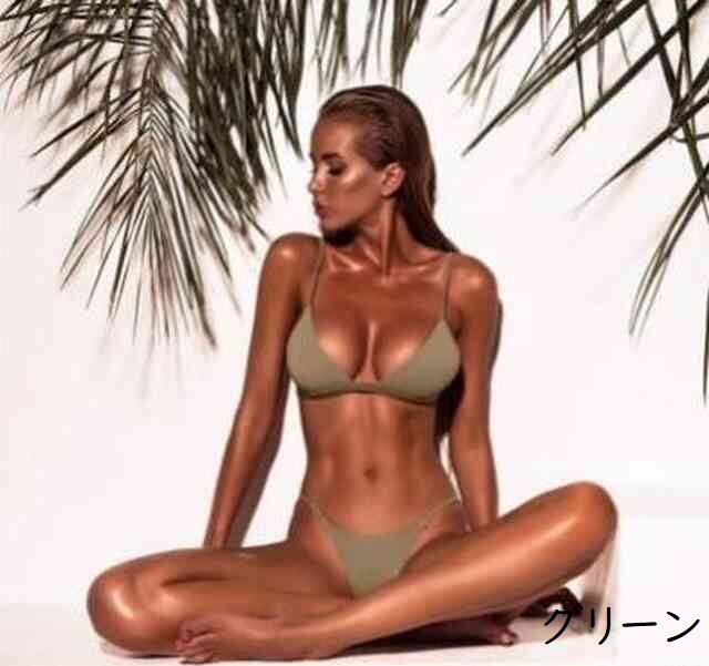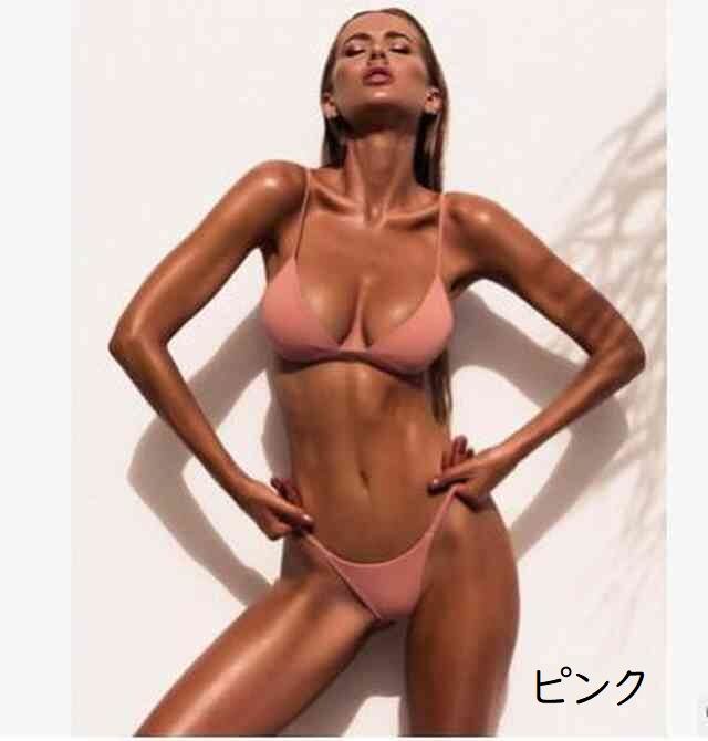 細めのストラップで露出度の高いシンプルデザインのビキニです。