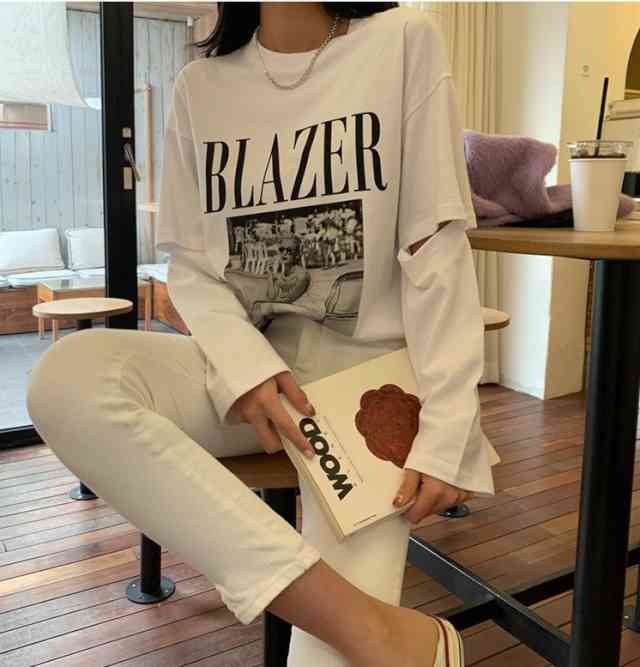 Tシャツ ロゴ レディース カットソー ティーシャツ ビッグ ゆったり オーバーサイズ 長袖 ロングTシャツ ロンT 大きいサイズ ゆるい ロゴプリント カジュアル 可愛い お洒落 シンプル 普段使い 袖カッティング ユニーク ストリート