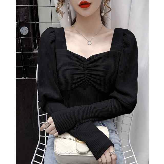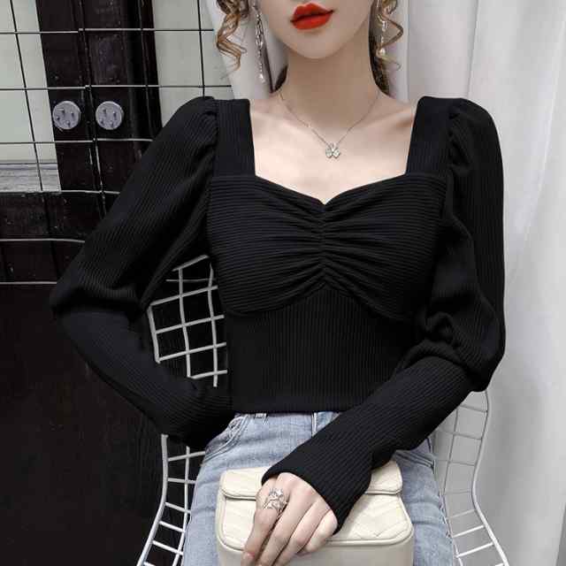 カットソー レディース Tシャツ 長袖 大きいサイズ レトロ感 スクエアネック パフスリーブ カジュアル シンプル 大人可愛い フェミニン エレガント キュート ガーリー 清楚 甘め シック 新作 人気 他とは被らない 綺麗 上品 ゴージャス