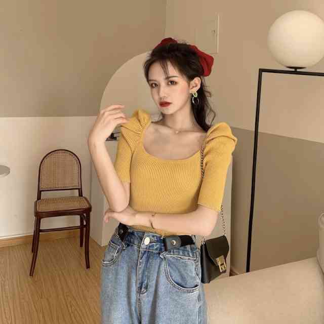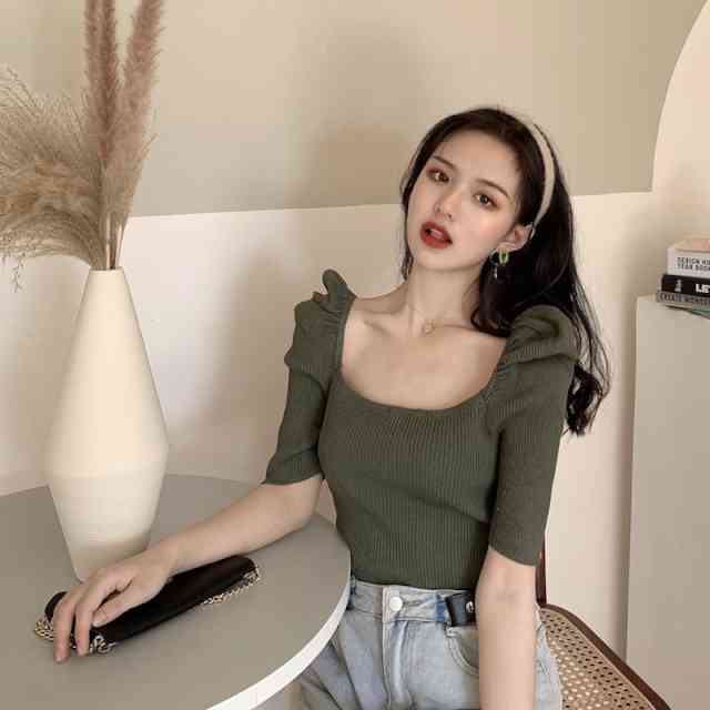 カットソー レディース Tシャツ 半袖 大きいサイズ ニット セーター タイト パフスリーブ バブルスリーブ カジュアル 綺麗 可愛い 大人女子 普段使い お出かけ デート フェミニン お洒落 甘め シンプル 無地 キレイめ スクエアネック OL