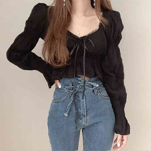 カットソー レディース 長袖 大きいサイズ カジュアル 綺麗 可愛い 大人女子 普段使い お出かけ デート ゆったり ブラウス スクエアネック パフバルーン袖 クロップド丈 リボン ガーリー フェミニン 甘め キュート 体型カバー ボヘミアン