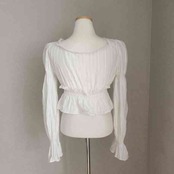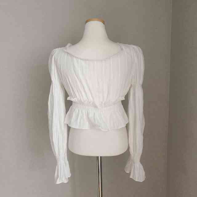 スクエアネックにリボンが付いたフェミニンデザインのパフバルーン袖ブラウスです。