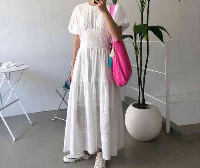 ワンピース レディース ロング丈 カジュアル 半袖 大きいサイズ ワンピ 二の腕カバー 美脚効果 足長 エレガント マキシ 綺麗 上品 シンプル キュート 可愛い 大人女子 お洒落 ハイウエスト ボリュームスリーブ 総レース ふんわり 旅行