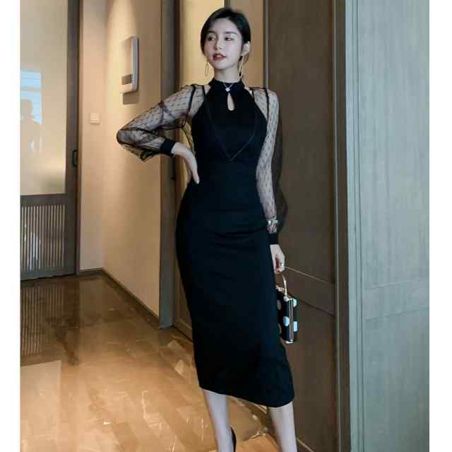 パーティードレス 結婚式 ドレス ワンピース レディース 二次会 お呼ばれ パーティー 大きいサイズ ミディアム シースルー タイトスカート 長袖 フォーマル エレガント 上品 クラシック クラシカル モノトーン 清楚 デート セレブ 綺麗