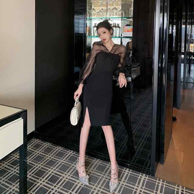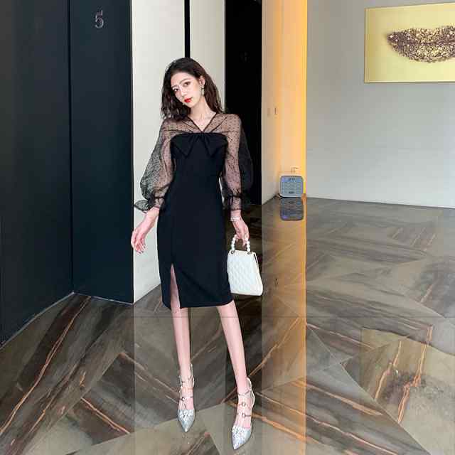 パーティードレス 結婚式 ドレス ワンピース レディース 二次会 お呼ばれ パーティー 大きいサイズ ミディアム タイト 長袖 スリット シースルースリーブ Vネック フォーマル エレガント 上品 クラシック クラシカル モノトーン デート